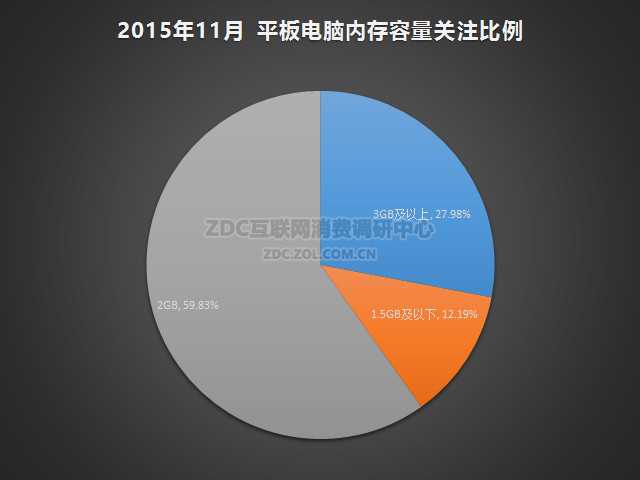 在内存容量方面,2015年11月中国的平板电脑市场上,内存容量为2GB的产品为市场的主流,吸引了接近六成的市场关注度;内存容量在3GB及以上和1.5GB及以下的产品关注比例分别为27.98%和12.19%。