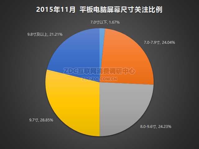 在屏幕尺寸方面,2015年11月的中国平板电脑市场上,9.7寸产品的关注度最高,关注比例为28.85%;其次是8.0寸-9.6寸的产品,关注比例为24.23%;7.0寸-7.9寸产品的关注比例为24.04%;9.8寸及以上平板电脑的关注度占比为21.21%,7.0寸以下产品的关注比例只有1.67%。