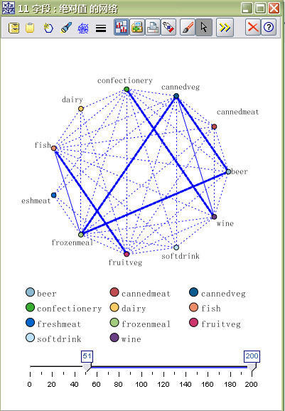 因为大多数产品类别组合都会出现在多个购物篮中,所以WEB上的强连接太多,无法显示模型表示的客户群。故我们要进行限制性WEB显示。