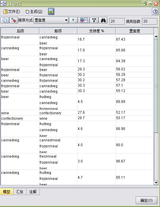 这些规则显示冻肉,罐装蔬菜和啤酒之间尊在多种关联。出现双向关联规则。