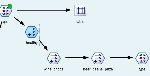 编辑最终的“派生”节点以将“派生”字段名称更改为健康。使用从wine到confectionery的链接重复该练习,并将最终的“派生”字段命名为wine_chocs.