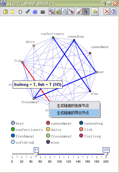 首先,必须获取每个群的标志。使用刚刚创建的web显示,可以自动生成每个群的标志,使用鼠标右键,单击fruitveg和fish之间的链接以突出显示该链接,然后右键单击并选择“为链接生成‘派生’节点”。