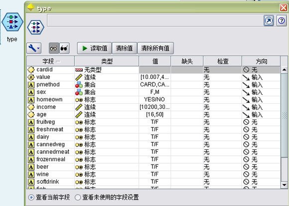 首先,需要使用Apriori大致了解购物篮内容的关系(关联)以生成关联规则,选择要再此建模过程中使用的字段,方法是:编辑“类型”节点,将所有产品类别的角色设置为两者,并将所有其他角色设置为无。(双向表示该字段可以是结果模型的输入或者输出。)