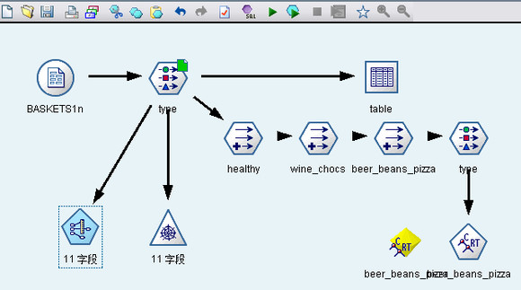 本例使用baskrule的流,该流引用名为BASKETS1n的数据文件。这些文件可在Clementine安装文件的Demo目录中找到。文件baskrule位于streams目录下。