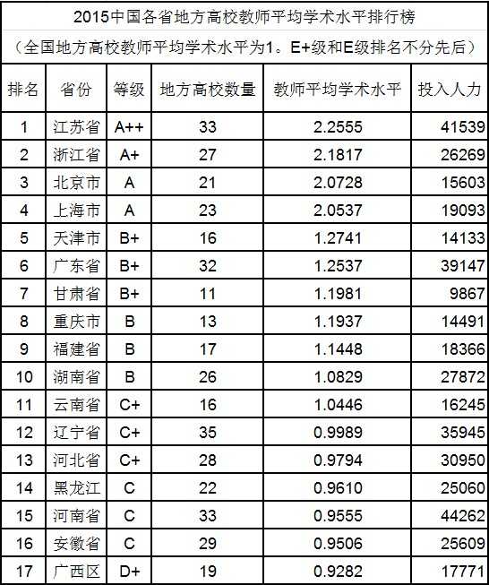 五、2015中国各省市区大学教师水平和效率排名北京江苏上海浙江居前四名
