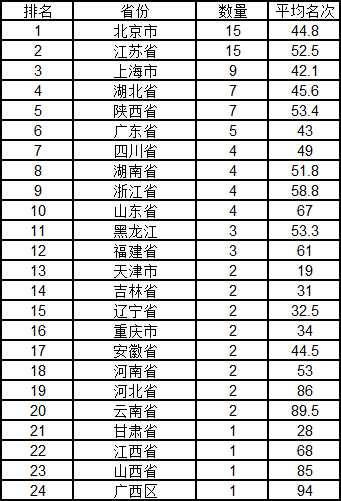 各省市区进入2015中国大学综合实力100强的数量及平均名次见下表。排名按数量排序,数量相同按平均名次升序排序。