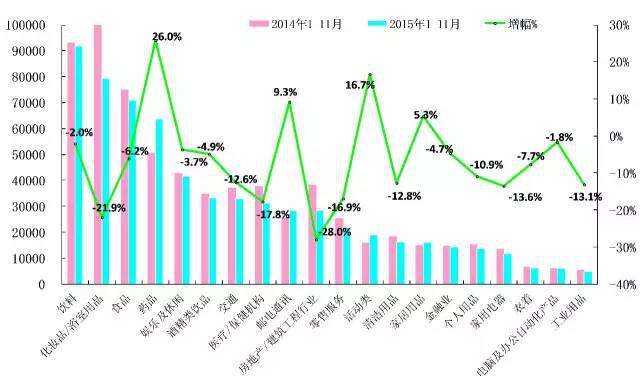2015年1-11月多年稳坐第一大广告行业的化妆品及浴室用品出现高达21.9%的降幅,失去了老大的位置。饮料行业虽然坐上首位,但也是由于2.0%的较小降幅而使得其投放规模超过了化妆品及浴室用品。值得关注的是,占到广告市场规模七成的前8个行业中,只有药品广告增长了26.0%,其它行业全都下降。在所有行业中,降幅最大的是房地产行业,降幅达到了28.0%。此外,降幅达到两位数的还有交通(汽车)12.6%、医疗保健机构17.8%、零售业16.9%、清洁用品12.8%和家用电器的13.6%。