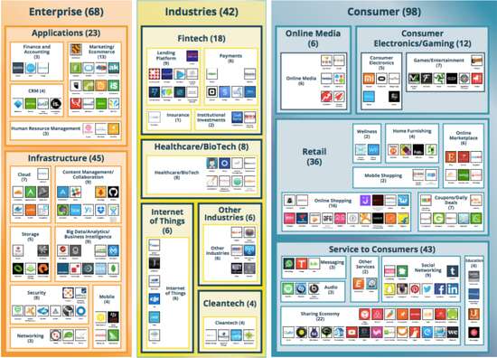 78%的独角兽面向消费者领域,尤其是零售业和共享经济。零售业的独角兽包括手工艺品电商Etsy和奢侈品电商Gilt。共享经济领域的独角兽则包括像短租平台Airbnb和打车Lyft这样的知名公司。另有112家独角兽从事企业科技基础设施或者垂直行业,如金融科技、医疗科技、清洁技术以及时下相当热门的物联网。