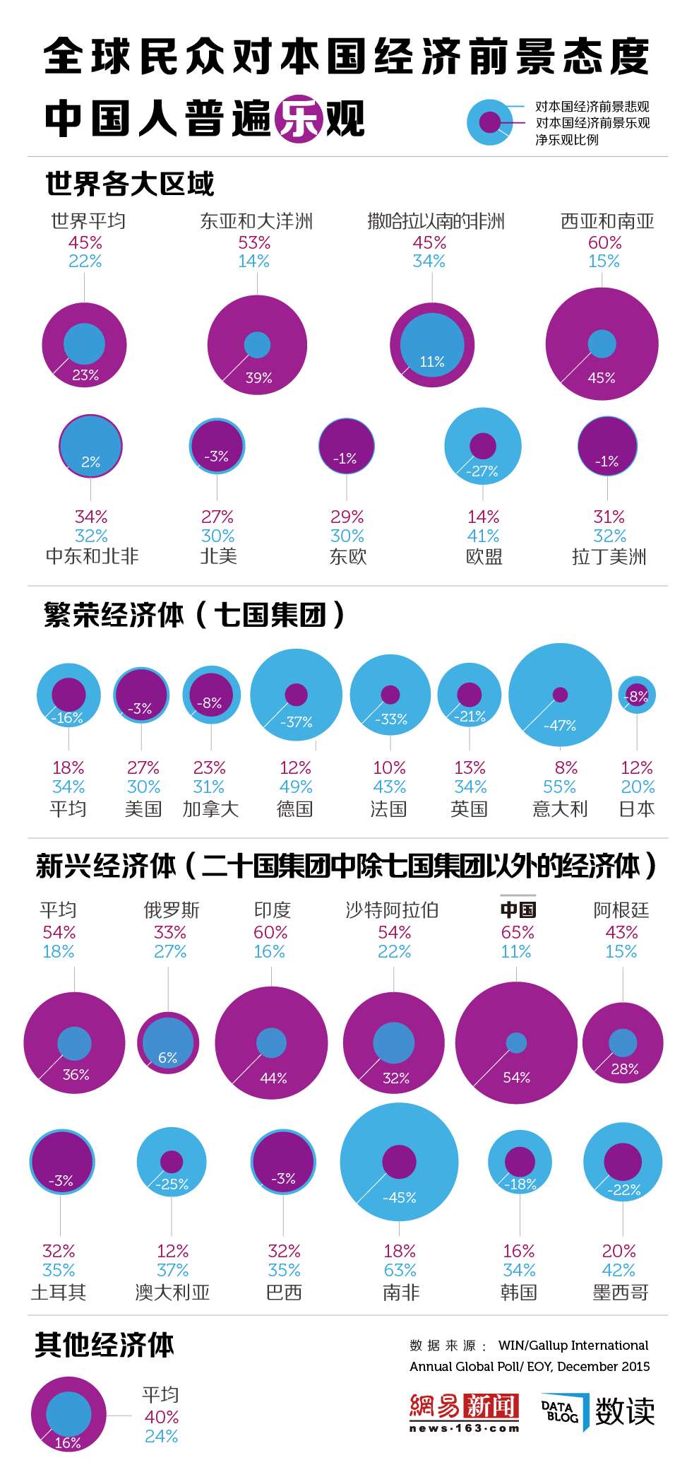 就世界平均水平而言,45%的民众对2016年本国经济状况持乐观看法,预计2016年会变得更好,仅22%的人认为情况会变糟。同时,不同区域民众的看法有明显差异:最乐观的地区是西亚和南亚(净乐观比例为45%),其次为东亚和大洋洲(39%),欧盟和北美最为悲观:欧盟国家的净乐观比例为-27%,41%的民众认为2016年的经济将会面临更多困难。