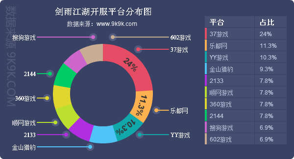 点评:《剑雨江湖》本周在各平台的开服占比并未发生明显的变化。自产品正式运营4个月以来,开服趋势一直保持上扬姿态。新增分布占比平台顺网游戏、602游戏。