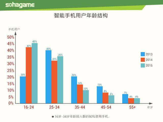 2015年,越南智能手机用户16-24岁占45%,25-34岁占35%,意味着16-34岁占智能手机用户的80%,智能手机用户年轻化。