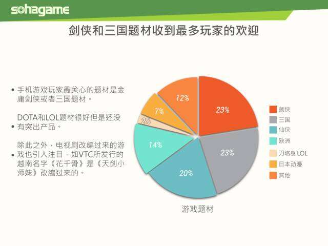 越南用户最喜欢的题材是金庸剑侠和三国题材,2015年发行的游戏中,剑侠和三国各占23%,仙侠占20%;用户也喜欢DOTA和LOL的题材,但没有什么突出产品,所以只占了2%的市场份额。
