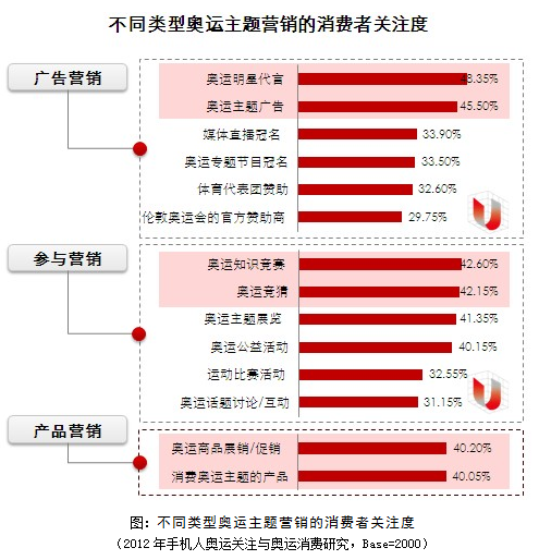 通过纵向的比较会发现,广告营销中的明星效应最为显著,受关注程度位居其次的是参与营销中的竞赛或竞猜式活动,最后是产品展销等产品营销手法。可见,充分利用公众人物和奥运主题的影响力至关重要,消费者的参与体验也是必不可少的,而单纯依靠产品本身的吸引力则效果欠佳。