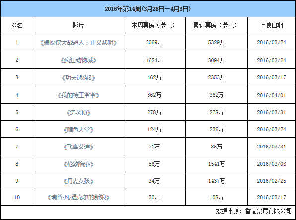 香港票房本周几部上榜影片表现抢眼,排在第一位的《蝙蝠侠大战超人:正义黎明》深受影迷喜爱,周票房达到2069万港元,累计票房更是突破5329万港元。这也拉大了与第二名《疯狂动物城》之间的差距,两部影片均在3月24日登陆香港,在一定程度上削弱了“风头正劲”的《功夫熊猫3》吸金势头。曾经在两周前登顶的《功夫熊猫3》已落至第三位,以目前状态来看累计票房想要突破3000万港元可能会需要几周时间。