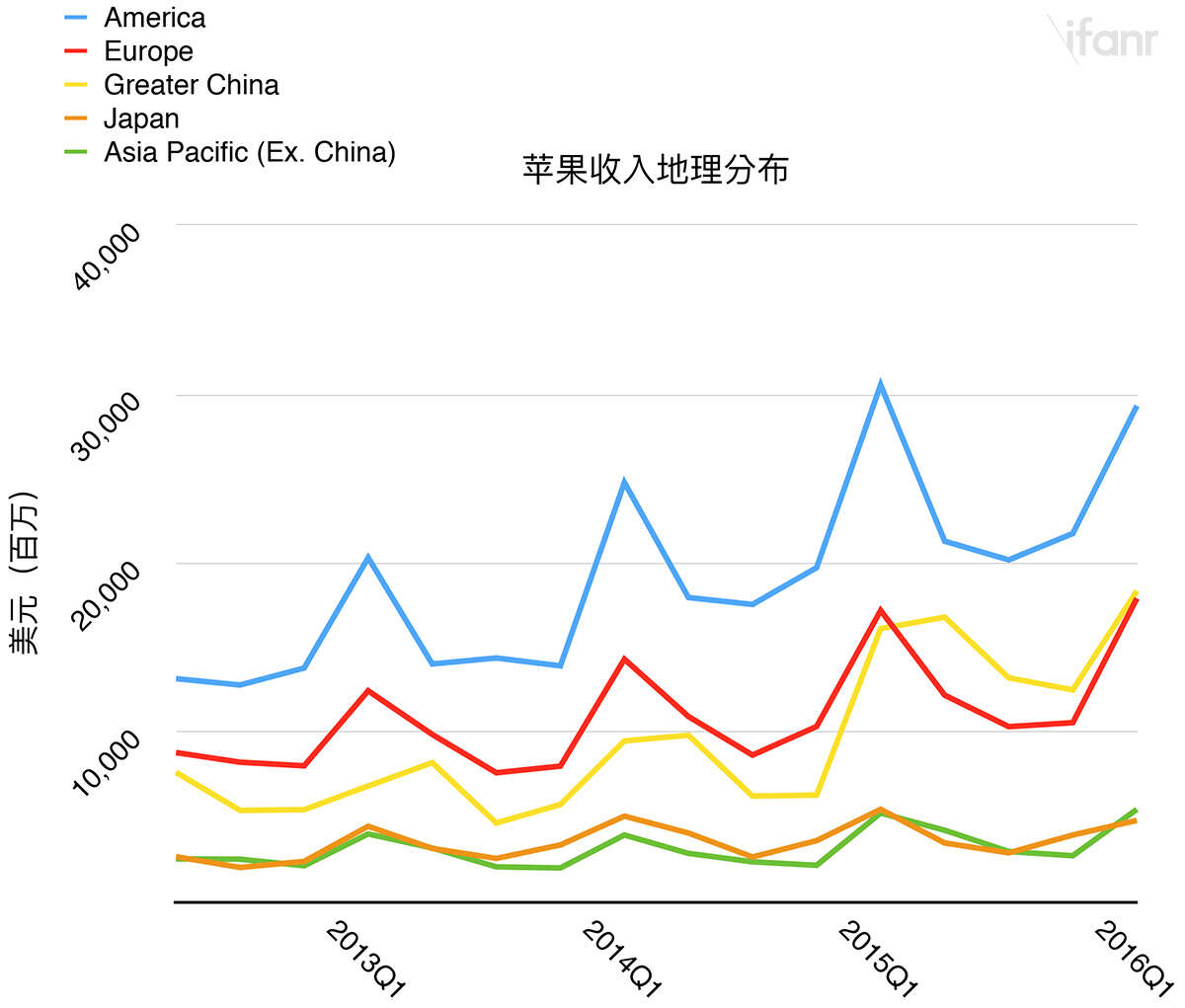 如果说美国的 PC 销量下滑,其效应要等到 5 年后才在桌面互联网上显示出来;那更要命的是全球的移动设备增长其实也开始停滞不前,美国当然也不意外。根据 Gartner 的数据,美国的移动设备销量在 2016 年也将停滞不前。下图是近年苹果公司总营收的地理分布:2016 年苹果在美国的营收首次出现同比下滑,考虑到当年苹果的总营收有 68.1% 来自 iPhone,这数据某程度上也能反映美国的智能手机销量增长势头亦见放缓。