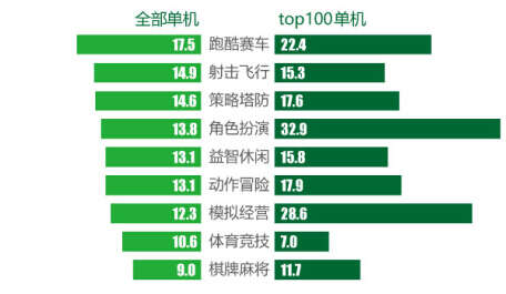 对于单机ARPPU而言,跑酷赛车ARPPU值达17.5元,位居所有类型的第一,但在TOP100中,角色扮演的ARPPU高达32.9元。