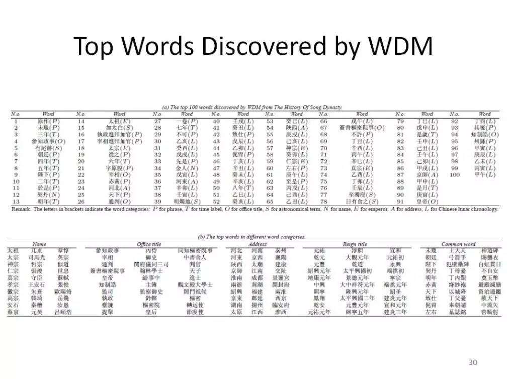《宋史》上做了例子,《宋史》将近600万汉字,10分钟左右算出来,我们学到8万有意义的词和词组,排到前一百个,天干地支都在里面,重要的宋代官职这样一些有意义的词汇都可以很准确抓取到。我们也可以手工做分类,这是人名这是官名这是地址这是官号,这是传统名词,皇帝的名词,大臣的名词还是准确抓取到了,所以认为这个还是一个蛮有效的算法。我们用同样的思路,把它放在一个空间上,可以把不同的颜色标准不同的词。