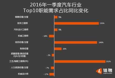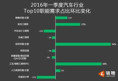 在汽车细分职能中,销售经理/主管这一职位的需求占比在2016年一季度达到了14.95%,在该行业所有职能中排名第一,创造了过去五个季度以来的最高纪录,其需求占比同比增长5%,环比增长11%。