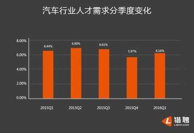 国内中高端人才发展平台猎聘发布了今年一季度汽车行业人才报告。报告显示,汽车行业的人才需求占比在全行业中排名靠前,在过去五个季度中排名持续稳定。