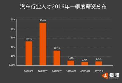 在全国整个汽车行业,平均年薪为10-20万薪资分布的人群最多,比例最大,占到46.69%;其次是平均年薪10万以下的人群,占比为27.35%。而拥有平均年薪40-50万的人群比例最小,仅占2.36%;其次是平均年薪50万以上的人,比例为3.35%。