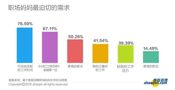 时刻保持联系,正在成为越来越多白领的工作状态。即使在工作时间之外,如有需要也得随时切换入工作状态。通过对“职场妈妈最迫切需求”的调查显示,女性生育后职场需求排名第一和第二的分别是“可自由支配的工作时间”和“8小时工作时间外,家庭第一位”,其得票率分别为76.5%和67.11%。