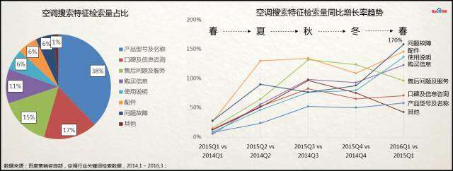 但是从每个季度的搜索特征检索同比增长来看,在2016年Q1,问题故障,配件,使用说明和购买信息的检索需求同比增速最大,小编分析这是由于长期以来空调功能主要集中在制冷,当遇到2016年一季度连广州都会下雪的极端天气时,网民对制暖功能的使用频率提升,这也就促使购买需求,产品使用问题的检索量提升。