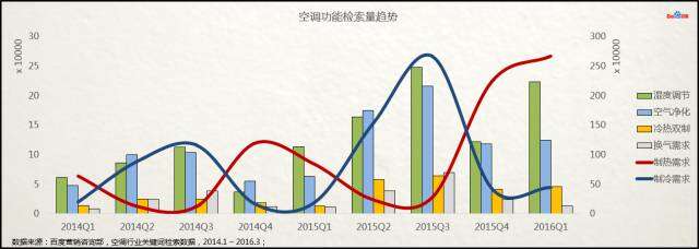 当网民在使用空调的时候,会集中存在制冷,制热,冷热双制,湿度调节,空气净化和换气等需求。我们从百度搜索大数据中可以看到,制冷制热的需求量最高,随季节波动显著;湿度调节需求从每年第一季度开始逐渐提升,在第四季度回落;空气净化和换气需求则更集中在第二、三季度。