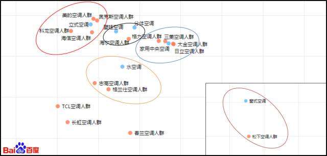 从百度思南的人群分析结果来看,Top15品牌人群可以划分为六类。第一类,美的,格力,海尔组成的国产空调人群,这类人群与空调大行业人群也最相似;第二类,大金,三菱,日立,松下组成的日资空调人群;第三类,奥克斯和海信人群;第四类,科龙和志高人群;第五类,格兰仕和TCL人群;第六类是春兰和长虹人群。