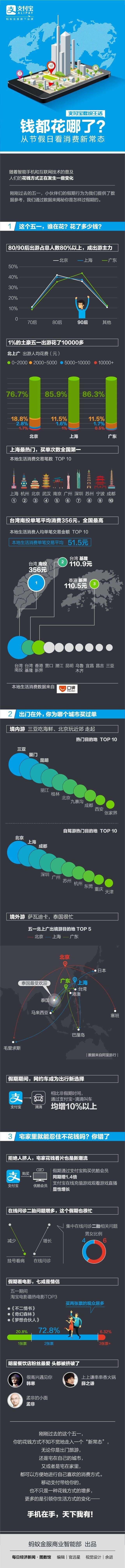 你绝对没想到 出游花费最多的地方是台湾的这个县 你有没有发现,在节假日里,无论您是选择出游,还是宅在家里,网约车、网上订餐、网购、网上看电影等等,都已经在渗透您的生活。这次,我们通过支付宝一些生活数据,来揭秘您花钱生活的变化,通过这些变化可以看出——随着智能手机和互联网技术的普及,您的花钱方式其实已经不知不觉地走入了一个“新常态”。 更多阅读:龙途互动:中国消费者疫后旅游意向调研报告——2020年3月问卷结果与分析联通:2019年春运出境游大数据报告TNS:56%的中国游客出国旅游是为了体验当地文化中国出境游三大驱动力和营销启示劲旅咨询:图解2015国庆出境游前大数据携程:2014年中国在线出境旅游报告Mastercard:2014 年中国出境游消费者比例攀升同程旅行:2026年元旦假期旅游预订热度同比增30%2025年国庆中秋火车票大面积售罄,出境游预订量增70%五一出境游韩国跌出前十 泰国折桂日本第二世界玖玖:2015国庆出境游行前大数据报告报告显示2014年中国超一亿人出境游春节期间出境游APP火爆网易&蚂蜂窝:2014出境游用户行为报告搜房网财报:2013年Q1搜房网营收为9100万美元 同比增长55.6%