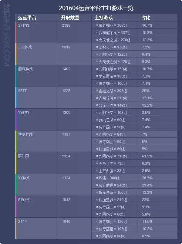 点评:本月榜单流水前十排名中前三依然为:37游戏、360游戏、9377。37游戏在开服数量上较上月有3.3%的增长,主打游戏《武神赵子龙》开服占比15.3%,相对来说《武神赵子龙》其吸金能力已初步显现。