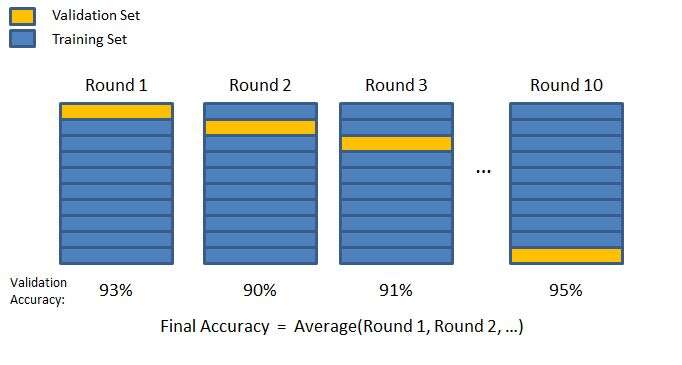 K层交叉检验的例子,在每一轮使用不同的数据进行测试(蓝色为训练数据、黄色为测试数据),方框下为每一轮的验证精度。最终的验证精度是10轮测试的平均数。图片来源:GitHub。