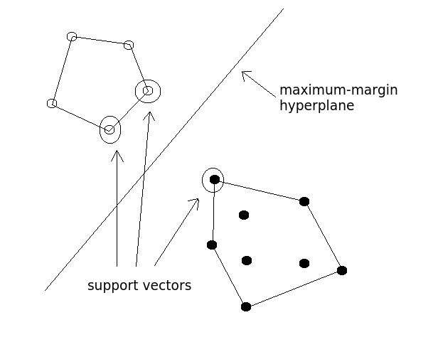 右上箭头:最大间隔超平面。左下箭头:支持向量。图片来源:KDNuggets。