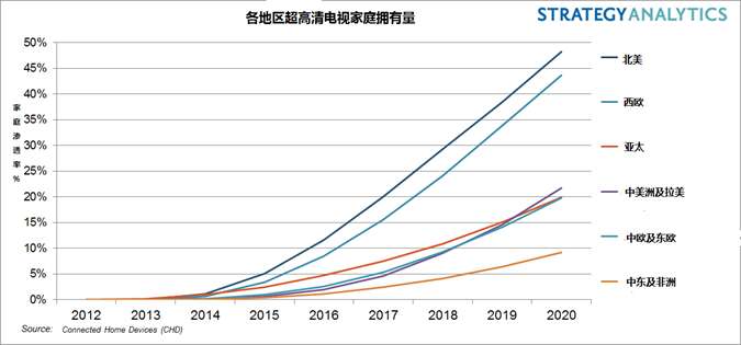 Strategy Analytics的最新研究显示,由于价格下降到普通民众可负担的水平,超过1100万的北美家庭将会在2016年拥有一台超高清电视,1080p型号开始完全从大屏幕产品线上消失。到2020年,所有在北美销售的40英寸或更大的电视都会是超高清机型,二分之一的家庭将会拥有至少一台超高清电视。