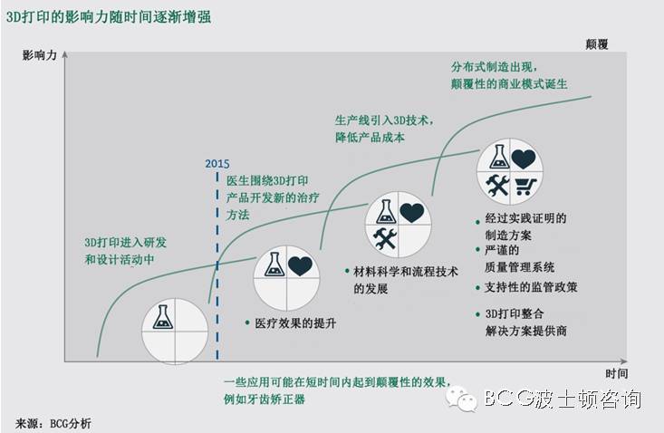 医疗企业应如何迎接3D打印技术的发展和颠覆趋势?我们认为以下几个步骤可以帮助企业从3D打印大潮中捕捉更大的价值。 做好战略预测。企业需要对未来可能发生的情景(2020、2025和2030)进行战略性预测,准备应对3D打印技术对企业产品和商业模式带来的冲击(见下图)。我们认为,3D打印产品的发展将保持较为稳定的速度,然而杀手级应用的出现会引领一波爆发式的增长。类似的情景曾在牙齿矫正器市场上演,3D打印产品让医生快速抛弃了传统的金属矫正器。做好战略预测能让企业对意料之外的颠覆做好准备,辨认应用的障碍,并快速采取应对措施。 系统性地评估应用价值。企业应拓宽思路,仔细评估如何利用3D打印技术提升疗效,加速治疗和康复过程,或满足之前无法满足的患者需求。同时他们应对产品和供应链进行分析,计算3D打印在材料节省、劳动力和模具等方面带来的成本节约。 开始试验。企业不妨投资一台3D打印机,看看它如何改善产品的设计流程。新的工具能激发人们以不同方式进行思考。在设计流程中,企业应大胆设想那些传统制造业无法完成的创新方案。 考虑进行并购或战略合作。时刻关注创新领域,评估商业创新在技术上成功的可能性,以及它们进入市场的潜力。值得注意的是,企业进行并购和结成战略合作伙伴的机会窗口正在不断缩小,领先的企业已经在这一领域投入重金。例如,化妆品公司欧莱雅就与Organovo合作,开发3D打印的皮肤组织。而强生公司正在与Tissue Regeneration System公司合作,研发定制化的、可被人体吸收的骨骼植入物。要投入3D打印领域,企业现在就要开始着手能力建设和筹集资本。 制定战略。根据企业不同的商业模式,3D打印预示着机会,也隐藏着危机。医疗技术产品从概念到产品的发展周期一般需要3-5年,而要建立一个强大的3D打印平台可能需要15年的时间。要保持竞争力,明智的企业现在就需要展开行动。 随着3D打印技术加速发展,它将在制造领域获得一席之地。而医疗企业有机会制造出人们前所未见的产品。3D打印技术有潜力在供应链、人工和物流等领域为企业削减成本。更重要的是,它能大幅提升产品的治疗效果以及患者可获得性。具有先见之明的企业已经开始行动,准备设计制造出突破性的产品。企业今天的行动,会决定它们未来的命运。