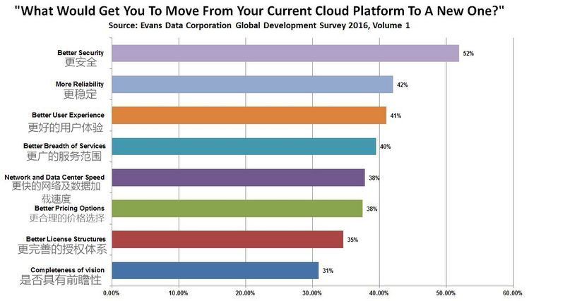“更安全”“更稳定” 以及 “更好的用户体验” 是促使开发者迁移到另一个云平台的最主要因素。其他附加考虑的因素还包括 “服务范围更广”(39.4%)、“网络及数据加载速度更快”(37.8%)、“价格选择更合理”(37.5%)、“授权结构更完善”(34.6%)以及 “是否更具有前瞻性”