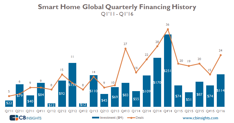 尽管2015年智能家居行业投资放缓,2016年第一季度投资活动明显复苏,交易量增长60%,达到24宗;投资额较前一季度增长54%。