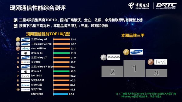 ▲现网通信性能综合测评中,前三甲机型分别被三星、vivo包揽