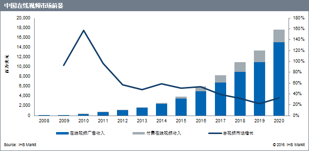 “中国在线视频市场的繁荣是由于消费观念以及中国中产阶级规模的日益壮大,”IHS Markit广告行业分析师陈晴臻说道。“广告商已经逐步增加其在线广告预算,这也是中国在线视频收入总体增长的主要原因。”