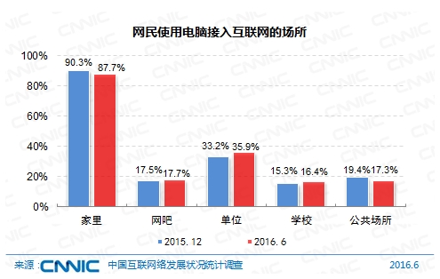 截至2016年6月,我国网民在家里通过电脑接入互联网的比例为87.7%,与2015年底相比下降2.6个百分点,在单位、学校、网吧通过电脑接入互联网的比例均有小幅上升,在公共场所通过电脑上网的比例略有下降,为17.3%。