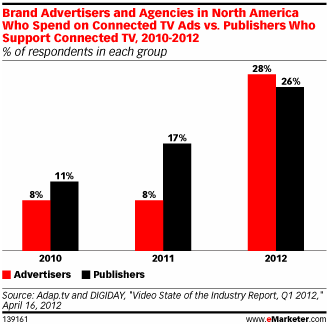 电视观众中也出现了越来越多的声音希望电视广告和在线视频能够尽早整合,这是推进整合的一个重要因素。这种利好条件也使得2012年北美28%的品牌广告及其推广商希望购买在线平台的广告,而这个数字在2011年还只是8%,这些统计都来自于Adap.tv以及DIGIDAY的报告。