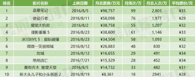 2016年8月全国总票房为40.5亿,是历年来8月的最好成绩。8月7日这一天,全国累计票房突破300亿大关,比2015年达成此成绩提前了29天。此外,电影业界担心的“奥运大小年”问题,由于里约奥运会的各大赛事时间多处于国内的凌晨至上午,因此未对电影票房有明显影响。
