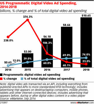 根据eMarketer的新报告“美国广告程序化购买支出预测:到2018年更多移动展示广告和视频广告支出将用于程序化购买”,今年程序化购买将占美国网络视频广告支出的60%,和2015年39.0%的份额相比增长明显。
