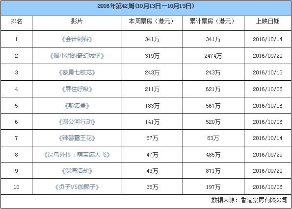 由于近期缺乏具有影响力的影片,香港影市不可避免的在大跌的路上前行。本周,曾登上榜首的《佩小姐的奇幻城堡》缩水超过500万港元,以319万港元的周票房排在第2位。原定12月1日才在香港上映的《会计刺客》提前露出真容,341万港元的成绩居然可以登上榜首“一览众片小”。