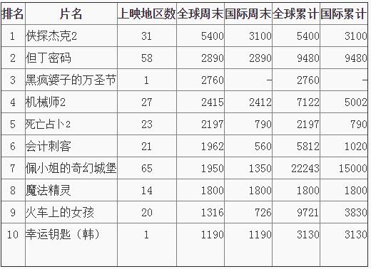 全球周末票房(2016.10.21-10.23)TOP 10(单位:万美元)