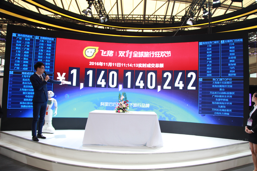 11月11日,双11狂欢购物节,2016中国国际旅游交易会在上海开幕。旅交会上,阿里巴巴旗下旅行品牌“飞猪”,进行了充满科技感、未来感的炫酷展示,同时,作为双11的“东道主”之一,飞猪也就双11进行大屏直播等线上线下的互动。