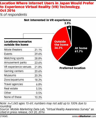 根据Mobile Marketing Data Lab在2016年10月份的一项调查得知,超过三分之一的日本互联网用户想要在户外体验VR(虚拟现实)技术,而将近三分之二的用户想要在家里体验VR技术,问题在于室内VR在成本和实体空间方面有多大可行性。