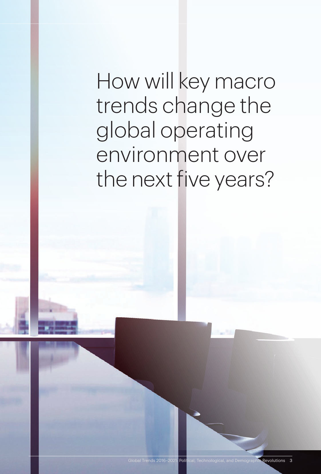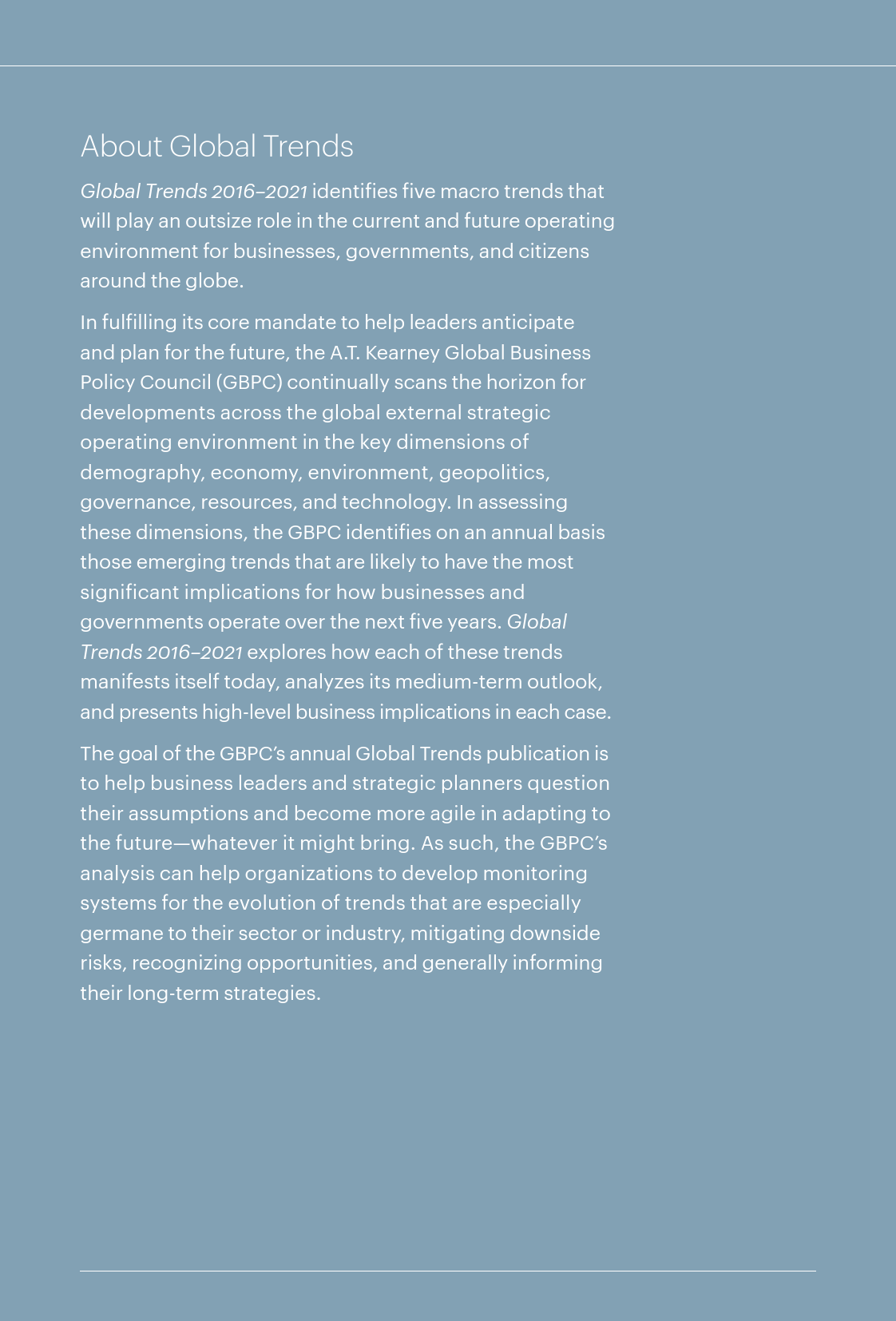 科尔尼(A.T. Kearney)在推出的《2016-2021全球趋势》(Global Trends 2016-2021)。报告中全球商业政策委员会(GBPC)提出了五大宏观趋势,认为它们将对全球当前及未来的企业和政府运营环境以及人们的生活环境产生巨大影响,从而帮助企业组织规避增长下行风险、识别商业机会、并为其建立长期战略提供信息。