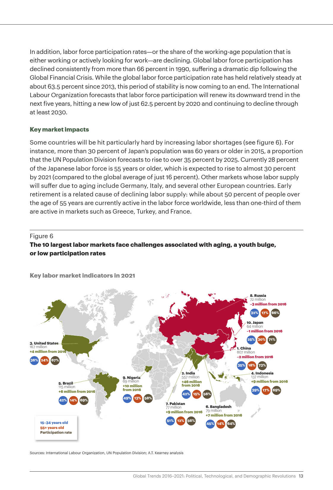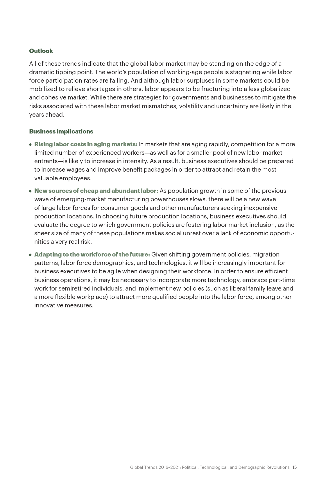 - 面临拐点的劳动力市场:全球劳动适龄人口数量历经了数十年的增长,现在已逐渐趋于停滞,但是劳动参与率却不断下降。尽管可以将部分劳动力过剩市场的劳动人口调动到劳动力短缺的市场,但是劳动力却趋于分散在全球化程度和集中化程度较低的市场,这可能会增加企业的成本。