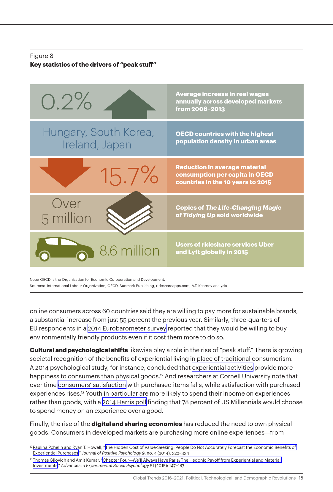 - “实物峰值”的消费主张:发达市场消费者的价值和偏好逐渐趋向于购买更少的实体商品,这主要源于这些国家提倡“少即是多”的生活态度,此外,相比拥有商品,消费者更注重商品体验。这为服务供应商创造了新的商业机会,同时,也为传统消费品集团和零售商提出了重大挑战。