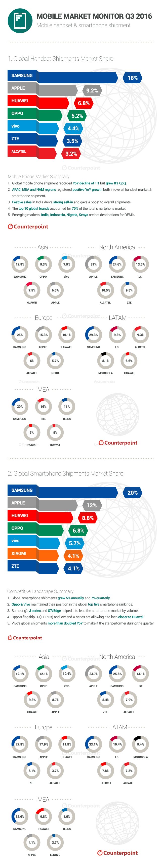 Counterpoint:2016年Q3全球手机出货量较去年同期下降1% 199IT原创编译 Counterpoint Research发布了2016年第三季度“市场监测报告”,调查发现: 第三季度全球手机出货量比前一季度增长8%,比去年同期下降1%; 亚太地区、中东是手机和智能手机出货量年增幅更高的地区; 印度假日销售推动手机出货量增长; 全球10大手机品牌占全球智能手机市场的70%; 印度、印度尼西亚、尼日利亚和肯尼亚成OEM(代工)的最热门地点。 199IT.com原创编译自:Counterpoint 非授权请勿转载 更多阅读:CounterPoint:2016年Q4 全球手机出货量较前一季度增长11%Counterpoint:2024上半年全球5G手机出货量同比增长20%Counterpoint:2014-2022年印度制造手机出货量复合年增长率达23%Counterpoint:2023年Q1印度智能手机市场出货量3100多万部 同比下降19%Counterpoint:2023年10月全球畅销手机榜 八国TOP5中iPhone占据首位Counterpoint:2024年第四季度全球晶圆代工行业收入同比增长26%Counterpoint:亚洲手机制造商主宰阿根廷手机市场Counterpoint:2024年Q2全球代工收入同比增长23%Counterpoint:预计2022年采用M系列苹果自研芯片iPad销量或达20%Counterpoint:2024年无线充电智能手机出货量同比增长14.2%Counterpoint:2025年全球1/3的智能手机出货量支持GenAICounterpoint:2024年H1全球智能手机出货量同比增长7%Counterpoint:2024年Q3全球可折叠智能手机出货量同比下降1%Counterpoint:2025年Q1印度智能手机出货量同比下降7%Counterpoint:2024年Q1印尼智能手机出货量同比增长4%